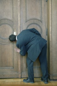 Man looking through keyhole of door, rear view